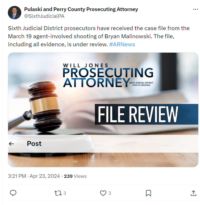 The Arkansas State Police Criminal Investigation Division (CID) investigated the Malinowski shooting. However, Arkansas State Police Director Col. Mike Hagar made a chilling statement late last month after his agency finished its investigation and sent the case to Sixth Judicial District Prosecuting Attorney Will Jones.