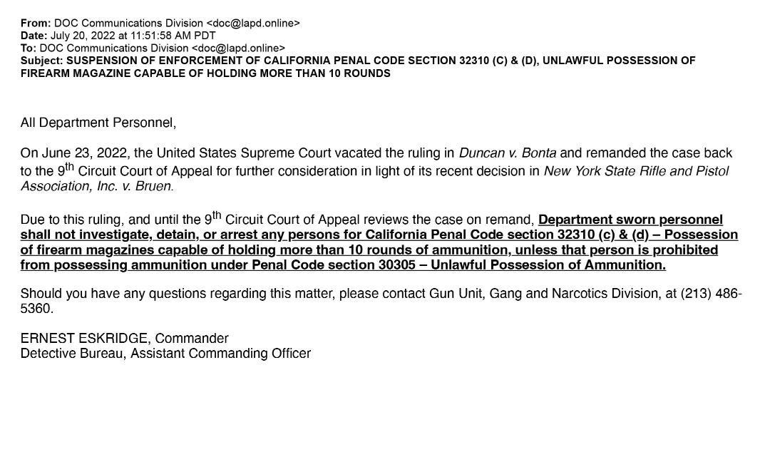 Because of this ruling, Eskridge said in the email, all sworn LAPD personnel shall not “investigate, detain or arrest” anyone for possessing a magazine capable of holding more than 10 rounds, unless they are already legally barred from possession ammunition in the state.