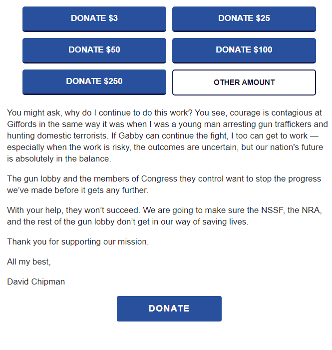 “You might ask, why do I continue to do this work? You see, courage is contagious at Giffords in the same way it was when I was a young man arresting gun traffickers and hunting domestic terrorists. If Gabby can continue the fight, I too can get to work — especially when the work is risky, the outcomes are uncertain, but our nation's future is absolutely in the balance,” Chipman wrote. “The gun lobby and the members of Congress they control want to stop the progress we’ve made before it gets any further. With your help, they won’t succeed. We are going to make sure the NSSF, the NRA, and the rest of the gun lobby don’t get in our way of saving lives.”