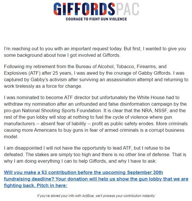 “I am disappointed I will not have the opportunity to lead ATF, but I refuse to be defeated. The stakes are simply too high and there is no other line of defense. That is why I am doing everything I can to help Giffords, and why I have to ask: Will you make a $3 contribution before the upcoming September 30th fundraising deadline? Your donation will help us show the gun lobby that we are fighting back.”